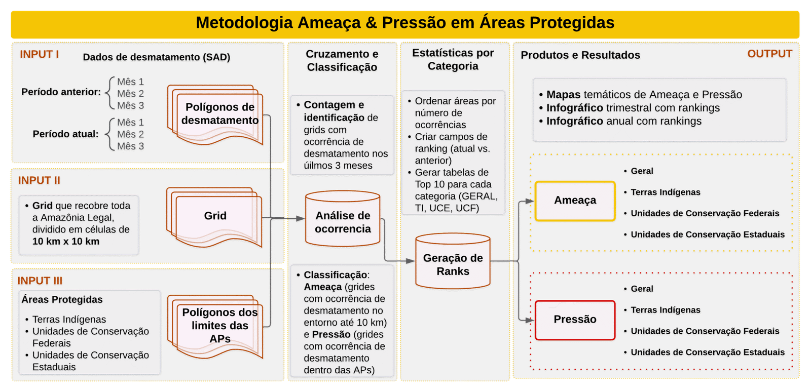 Áreas Protegidas (APs) representam um patrimônio nacional, e considerando a extensão das APs na Amazônia Legal (i.e., 4), os seus benefícios para a manutenção da biodiversidade, estoques de carbono e na geração de serviços ambientais, como a regulação do clima, transcendem a fronteira nacional, alcançando relevância global. Dada a importância das Áreas Protegidas (APs) como patrimônio ambiental, social e cultural, o relatório utiliza uma metodologia padronizada para identificar e comparar o grau de vulnerabilidade de diferentes territórios. A análise se baseia em dados recentes de desmatamento, que são cruzados com um grid que recobre toda a Amazônia Legal, dividido em células de 10 km x 10 km. Cada célula com ocorrência de desmatamento é contabilizada e associada ao território mais próximo.